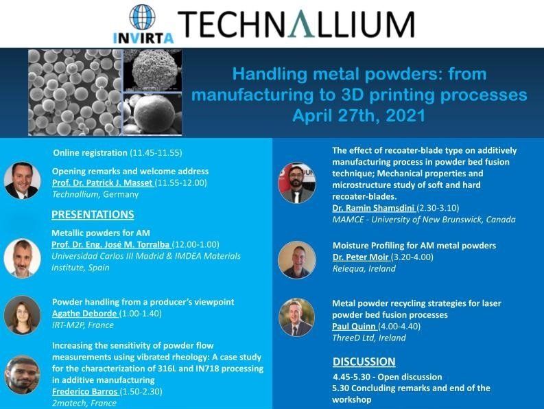 This workshop is part of a series dedicated to powder materials for AM and provides an overview of the key issues in powders for AM but not only. The speakers will be a combination of academic and industrial leaders.