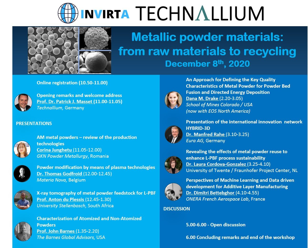 This workshop is the first of a series dedicated to powder materials for AM and provides an overview of the key issues in powders for AM. The speakers will be a combination of academic and industrial leaders.