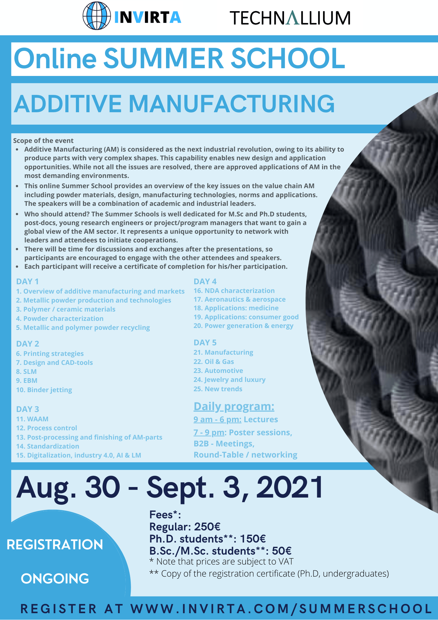 La fabrication additive (FA) est considérée comme la prochaine révolution industrielle, en raison de sa capacité à produire des pièces aux formes très complexes. Cette capacité permet de nouvelles opportunités de conception et d'application. Bien que tous les problèmes ne soient pas résolus, il existe des applications approuvées de FA dans les environnements les plus exigeants. Cette université d'été en ligne donne un aperçu des principaux problèmes de la chaîne de valeur AM, y compris les matériaux en poudre, la conception, les technologies de fabrication, les normes et les applications. Les conférenciers seront une combinaison de leaders académiques et industriels. Qui devrait être présent? Les Summer Schools sont bien dédiées aux étudiants en M.Sc et Ph.D, aux post-doctorants, aux jeunes ingénieurs de recherche ou aux chefs de projet/programme qui souhaitent acquérir une vision globale du secteur de la FA. Il représente une occasion unique de réseauter avec les dirigeants et les participants pour initier des coopérations. Il y aura du temps pour des discussions et des échanges après les présentations, les participants sont donc encouragés à s'engager avec les autres participants et conférenciers. Chaque participant recevra un certificat d'achèvement pour sa participation.