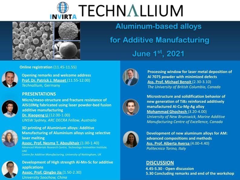 Les matériaux en poudre métallique sont utilisés dans de nombreux processus tels que la fabrication additive (AM), le moulage par injection de métal (MIM), la pulvérisation thermique, etc. Qu'allez-vous apprendre ? Nouvelles compositions d'alliages à base d'aluminium, leur conception et leur traitement pour obtenir des propriétés mécaniques exceptionnelles. Cet atelier fait partie d'une série dédiée aux matériaux en poudre métallique pour la FA et donne un aperçu des principaux problèmes et opportunités des alliages d'aluminium légers pour la FA mais pas seulement. Les conférenciers seront une combinaison de leaders académiques et industriels. Qui devrait être présent? Des membres tout au long de la chaîne de valeur, tels que des gestionnaires de programme, des experts techniques et des universitaires. Il y aura du temps pour la discussion et les échanges après les présentations, les participants sont donc encouragés à dialoguer avec les autres participants et conférenciers.