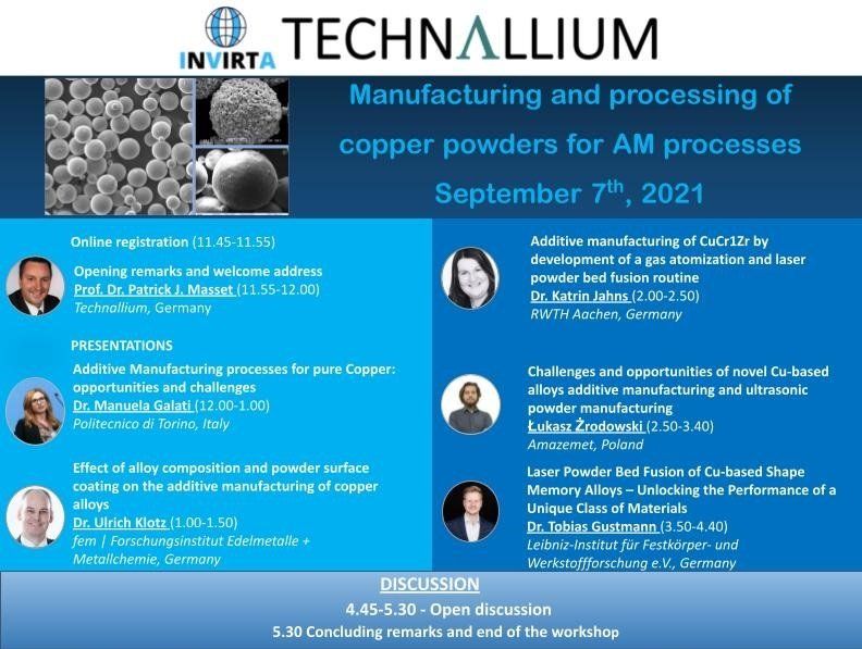 Les matériaux en poudre métallique sont utilisés dans de nombreux processus tels que la fabrication additive (AM), le moulage par injection de métal (MIM), la pulvérisation thermique, etc. Qu'allez-vous apprendre ? Nouvelles compositions d'alliages à base de cuivre, production de poudre, leur traitement pour obtenir des propriétés mécaniques exceptionnelles. Cet atelier fait partie d'une série dédiée aux matériaux en poudre métallique pour la FA et donne un aperçu des principaux problèmes et opportunités des alliages à base de cuivre pour la FA mais pas seulement. Les conférenciers seront une combinaison de leaders académiques et industriels. Qui devrait être présent? Des membres tout au long de la chaîne de valeur, tels que des gestionnaires de programme, des experts techniques et des universitaires. Il y aura du temps pour la discussion et les échanges après les présentations, les participants sont donc encouragés à dialoguer avec les autres participants et conférenciers.